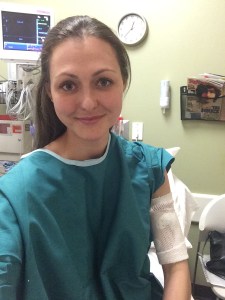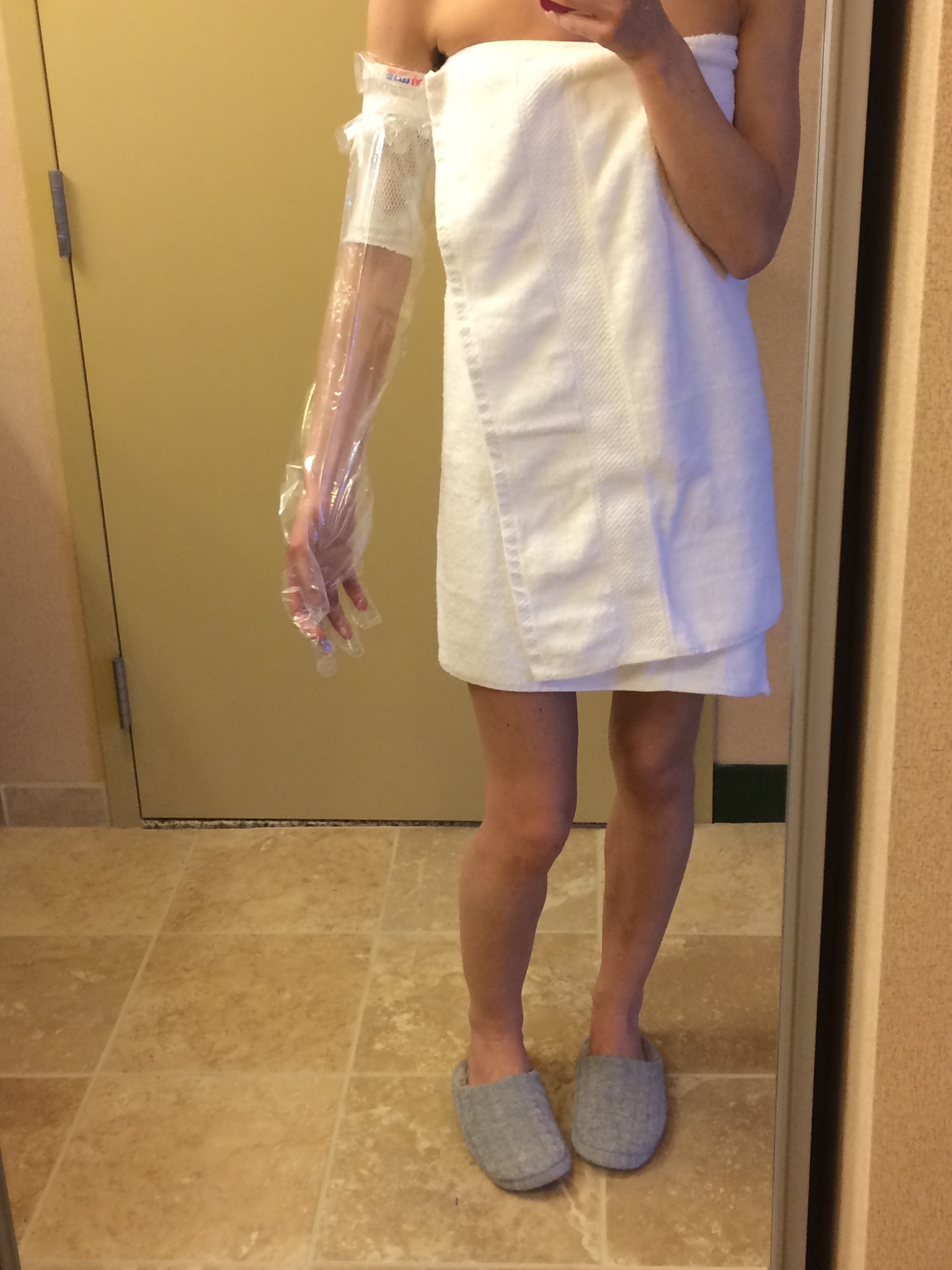 There are of course risks with having this access line put in, but I feel in my case the benefits far out weigh the risks right now. The procedure itself wasn’t too bad. Luckily I had the support of a friend of mine who was also in the US getting treatment for Lyme. We met through an online Lyme support group but she has become a true friend and support to me daily and our similarities go beyond life with lyme. We are both the same age, have big dreams and are grabbing onto all treatment opportunities in the hope to achieve remission. To have her and her mum by my side was just such a huge relief and comfort too. The hospital was really efficient and before I knew it I was in my glamorous gown and cap and ready to be wheeled into theatre. The doctors and nurses were good at making conversation and distracting me from the procedure. It didn’t take very long and insertion was not really that painful either. The area on the selected arm was numbed and carefully disinfected and then the only small pain was what I would describe as a hard pinch and the rest was pretty painless. The line was inserted using an X-ray as a guide to ensure it was correctly placed and not touching the heart. It was not long before I was wheeled back out of theatre with my new ‘accessory’, it was all a bit surreal! Later the same day I had increased pain in the arm but this is normal, it was just the medication wearing off and my body adjusting to this new foreign object.